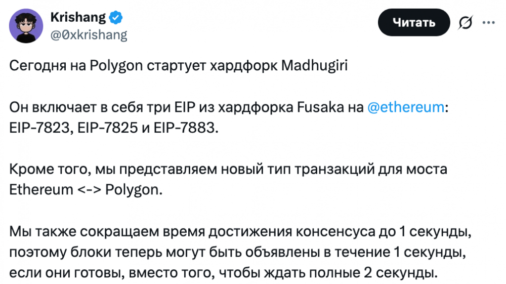 Основной разработчик Polygon Кришанг Шах сообщил в соцсети X, что обновление включает поддержку трех предложений по улучшению Ethereum (Fusaka EIP): EIP‑7823, EIP‑7825 и EIP‑7883. Эти предложения повышают эффективность и безопасность тяжелых математических операций за счет ограничения объема потребляемого газа.
