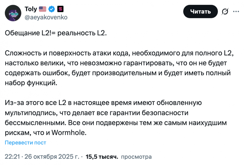 Layer-2-сети масштабирования имеют огромную поверхность для атак и настолько объемную кодовую базу, что ее невозможно качественно проверить на наличие программных ошибок. Средства пользователей также могут быть перемещены с L2-сетей, которые полагаются на мультиподписное хранение, без согласия самих пользователей, добавил Яковенко.