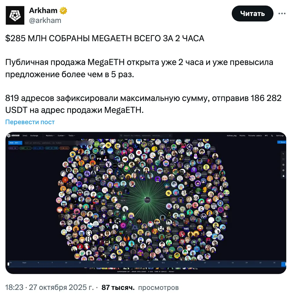 Сообщения в X указывают, что токены были раскуплены сверх лимита за минуты. Согласно данным блокчейн-аналитической платформы Arkham, всего за два часа объем заявок достиг пятикратного превышения лимита, при этом 819 адресов внесли максимальную ставку.