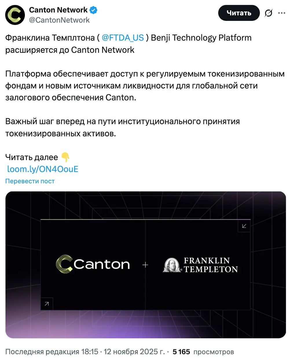 Franklin Templeton расширила свою платформу токенизации и инвестиций Benji, подключив ее к сети Canton. Это очередной шаг в развитии институциональной блокчейн-инфраструктуры для токенизированных инвестиционных продуктов.