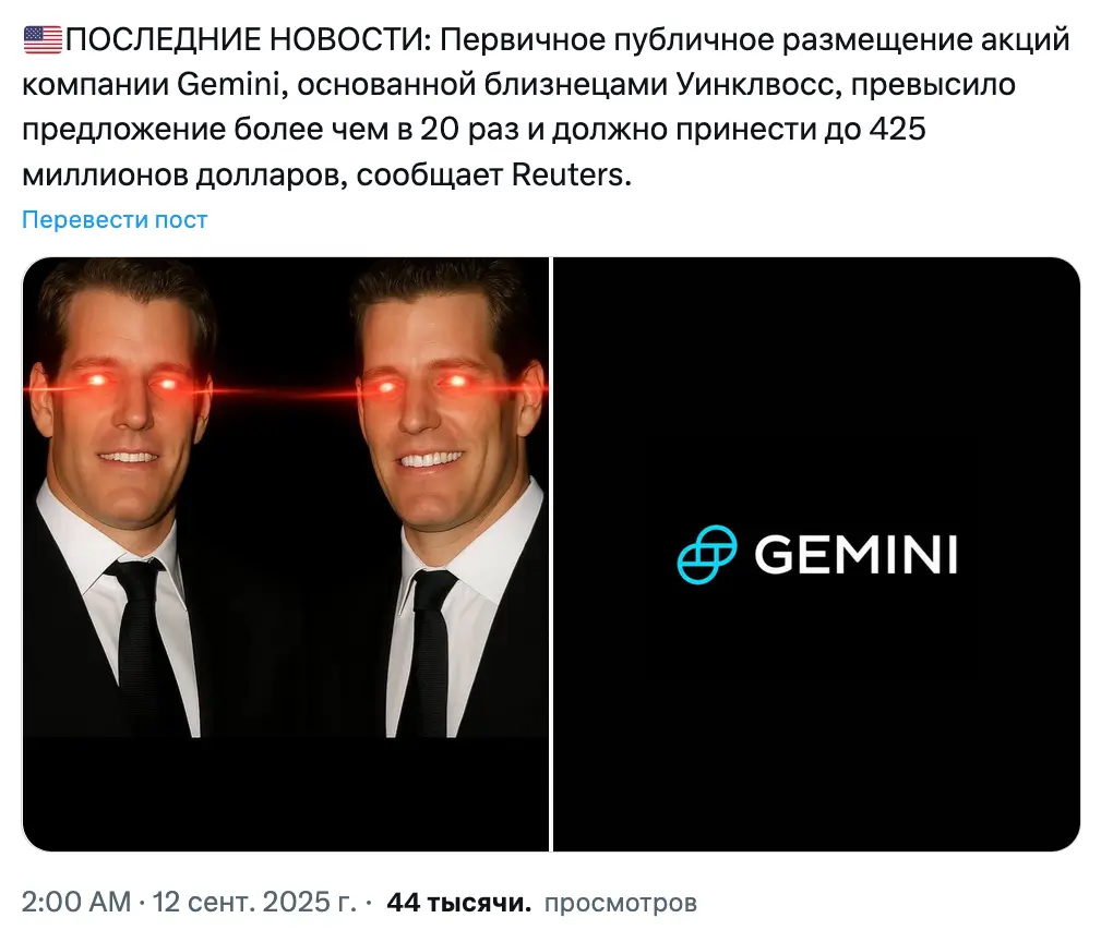 Ещё одна криптокомпания, вышедшая на биржу в этом году, — Gemini. Биржа, основанная Кэмероном и Тайлером Уинклвосс, дебютировала на Nasdaq в сентябре, повысив оценку IPO несколькими днями ранее.