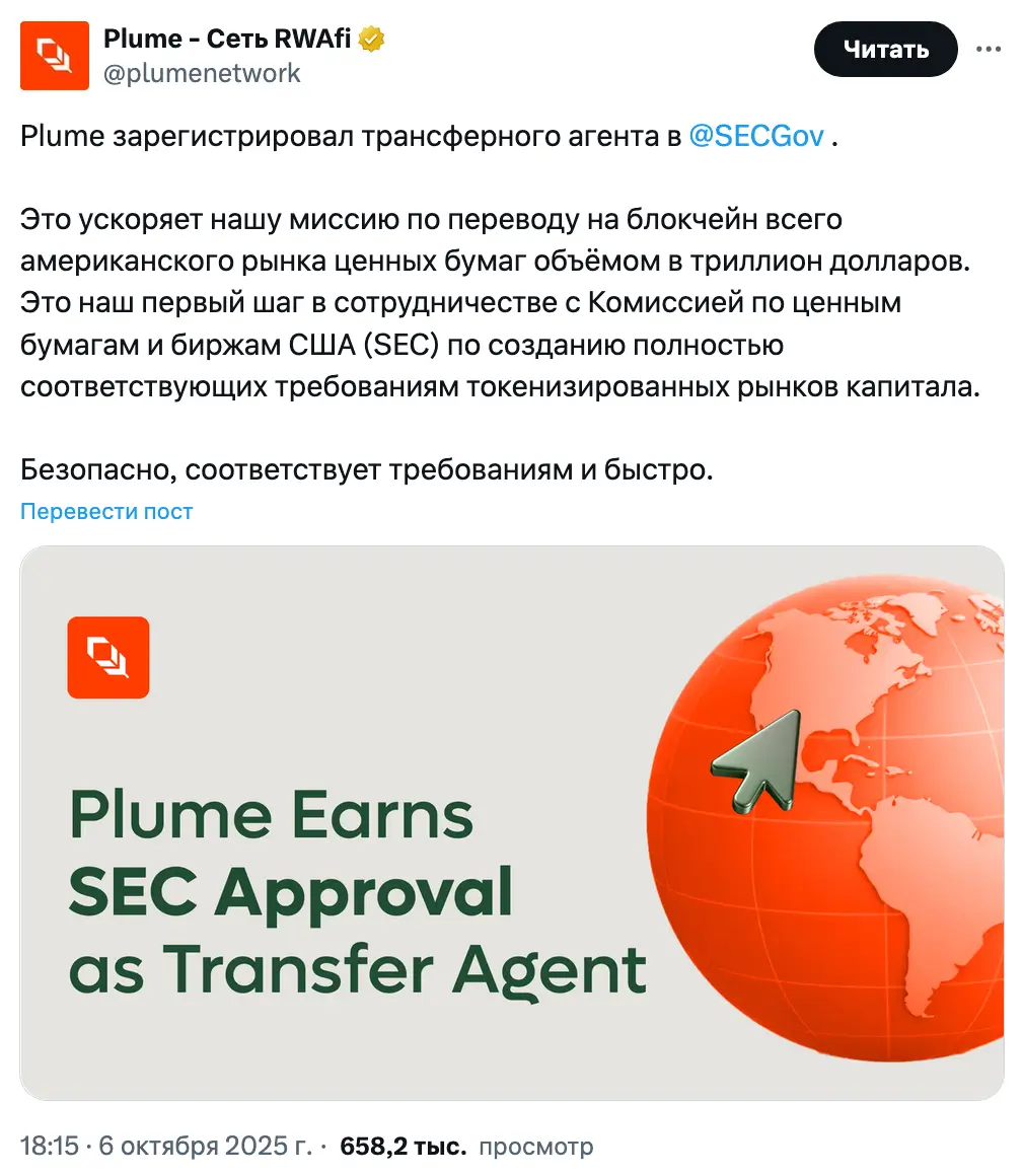 Plume Network получила статус трансфер‑агента SEC по токенизации ценных бумаг на блокчейне