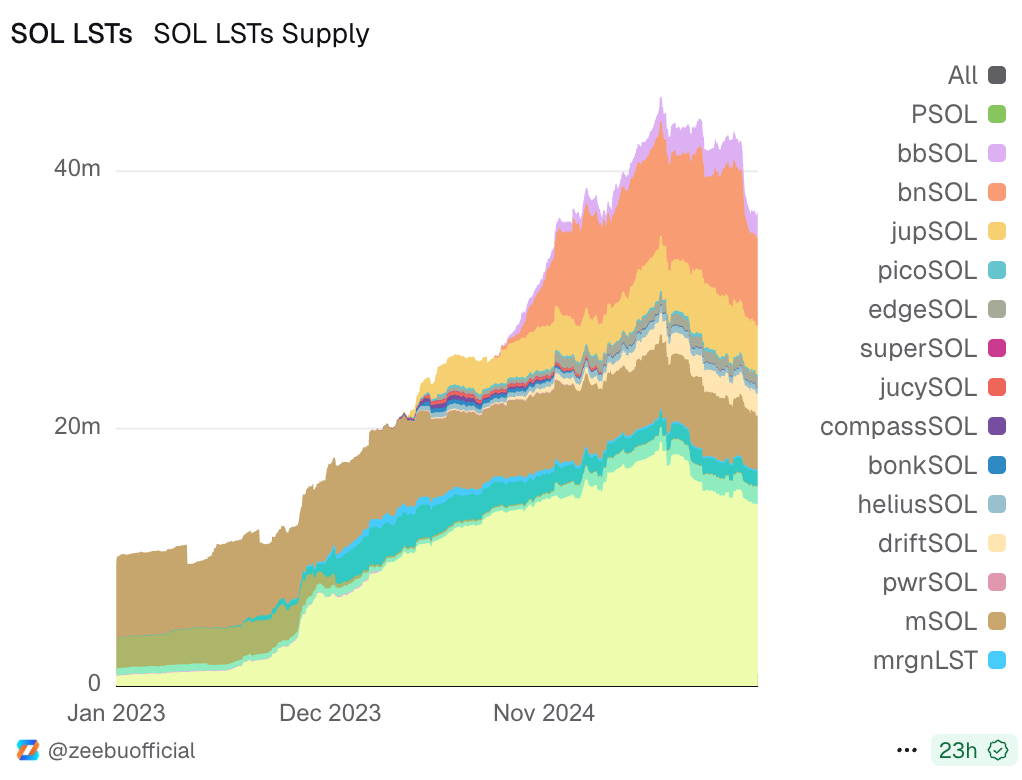 Подобно Ether, предложение токенов Solana LST удвоилось: с 20 миллионов в январе 2024 года до примерно 40 миллионов на момент написания статьи, при этом в смарт-контрактах на стекинг теперь заблокировано 67% предложения токенов Solana.