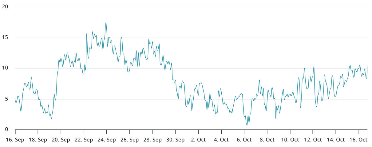 Дельта-скоу по опционам на биткоин превысила 10%, что свидетельствует о том, что профессиональные трейдеры платят премию за опционы пут (продажа), что является типичным признаком медвежьих настроений. В нейтральных условиях этот показатель обычно колеблется от -6% до +6%. Что еще важнее, скоу ухудшился с пятницы, что говорит о растущих сомнениях трейдеров в бычьем импульсе биткоина.