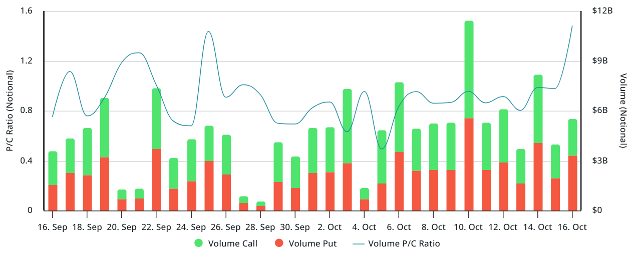 В четверг спрос на стратегии защиты от падения на Deribit резко вырос, поскольку объемы торгов пут-опционами превысили объемы колл-опционов на 50%, что свидетельствует о растущем напряжении на рынке. За более чем 30 дней индикатор достиг самого высокого значения. Криптовалютные трейдеры обычно настроены оптимистично, поэтому нейтральное значение соотношения пут/колл обычно составляет около -20%, что благоприятствует колл-опционам.